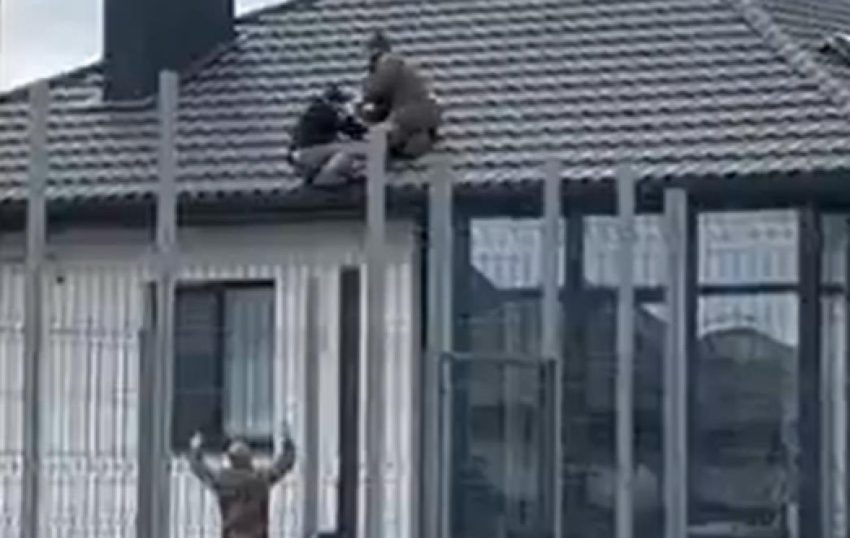 Там також можна побачити їхню сутичку на покрівлі будинку, яка закінчилася тим, що громадянина зіштовхнули з даху. Втім, упав і сам військовослужбовець.